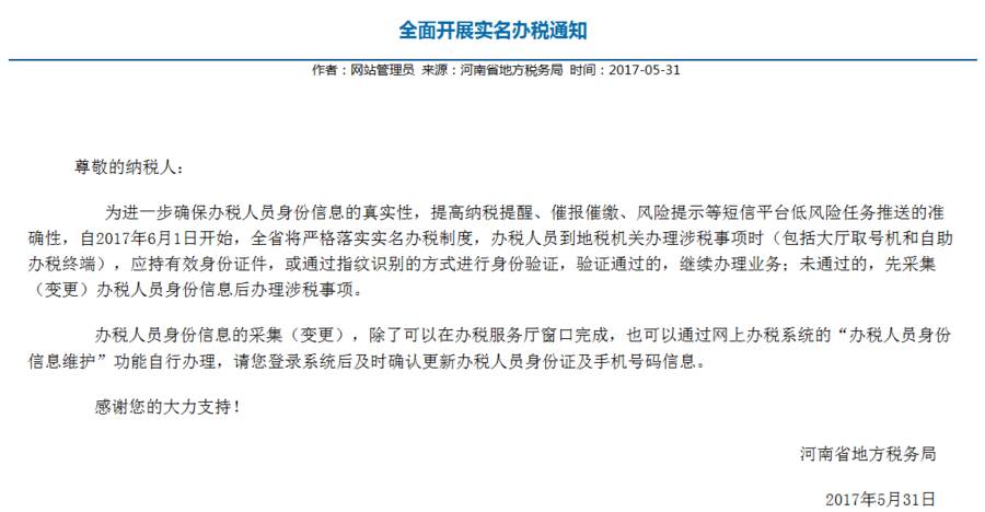 5月31日,河南省地方税务局发布公告:自2017年6月1日起,全省将严格落实实名办税制度,办税人员到地税机关办理涉税事项时,应持有效身份证件,或通过指纹识别的方式进行身份验证。