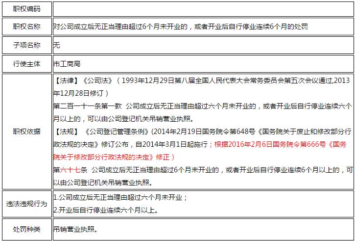 《公司登记管理条例》明文规定:“公司成立后无正当理由超过六个月未开业的,或者开业后自行停业连续六个月以上的,可以由公司登记机关吊销营业执照。”